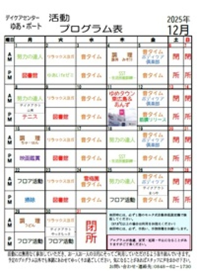 2025年12月 ゆあ・ポート予定表ができました。 ご覧ください。